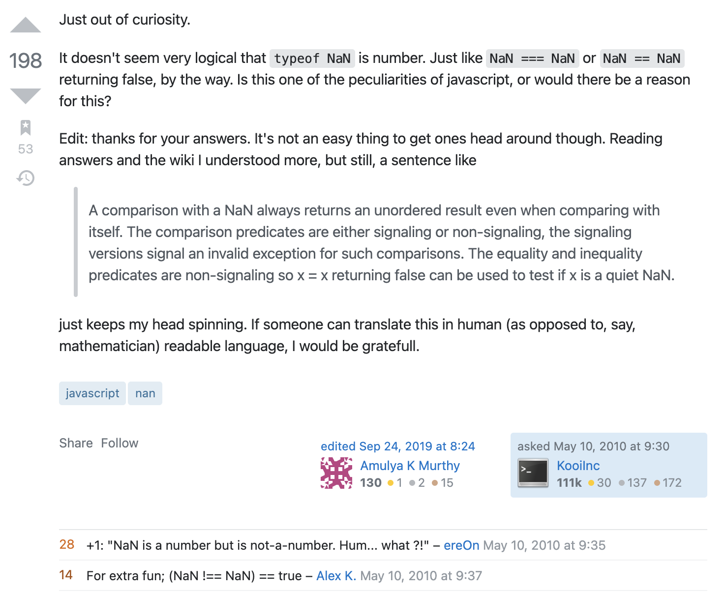 - ㄴㅇㄱ (NaN !== NaN) == true ㅋㅋㅋㅋㅋㅋㅋㅋㅋㅋㅋㅋㅋ.. 링크를 들어가 보면 그 이유를 대충은.. 알 수 있다. NaN는 숫자 유형이긴 한데, 정해진 특정값은 아닌.. 어쩌구.. 일단은 패스하자.