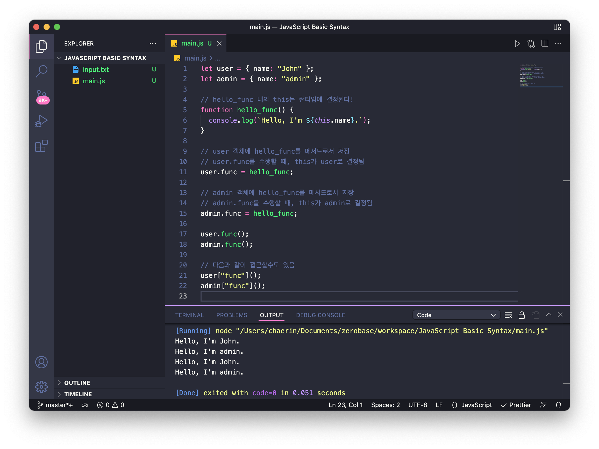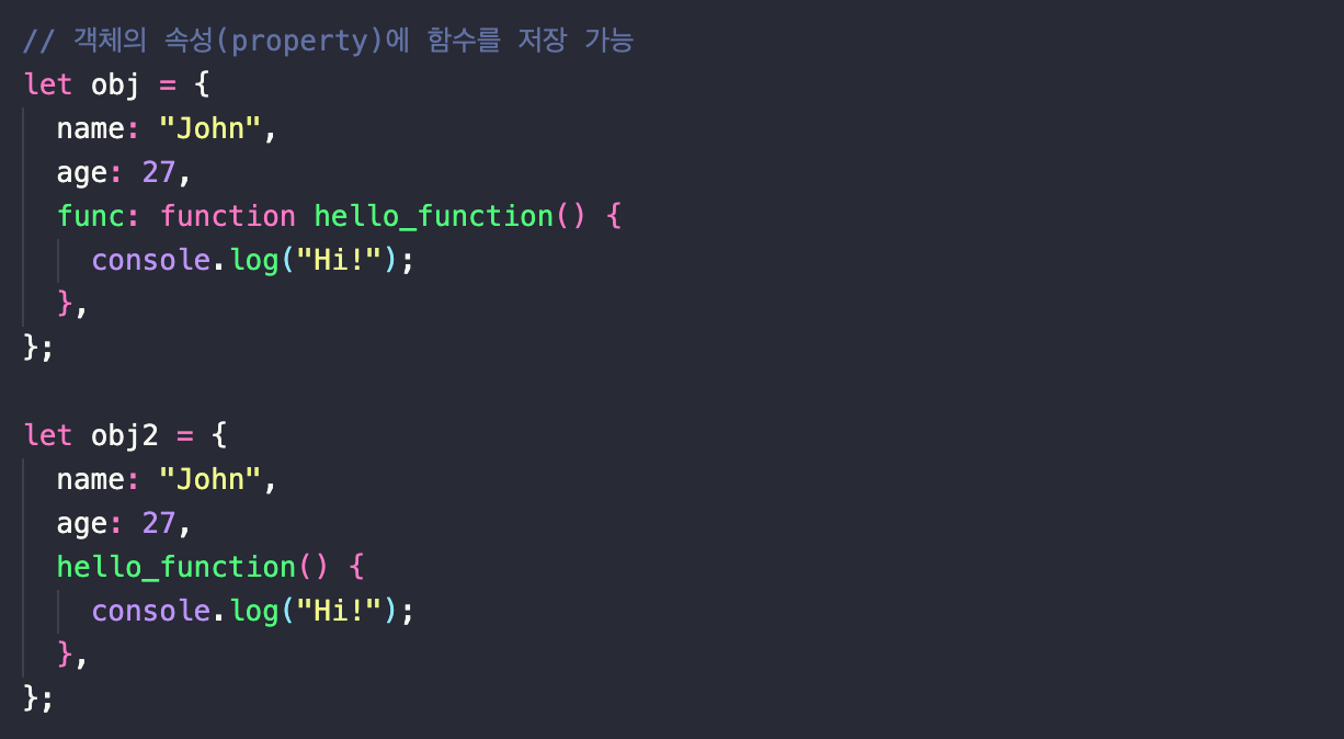 - 그리고 객체의 속성에 함수를 저장할 때에는 func: function을 생략해도 함수를 저장할 수 있다!