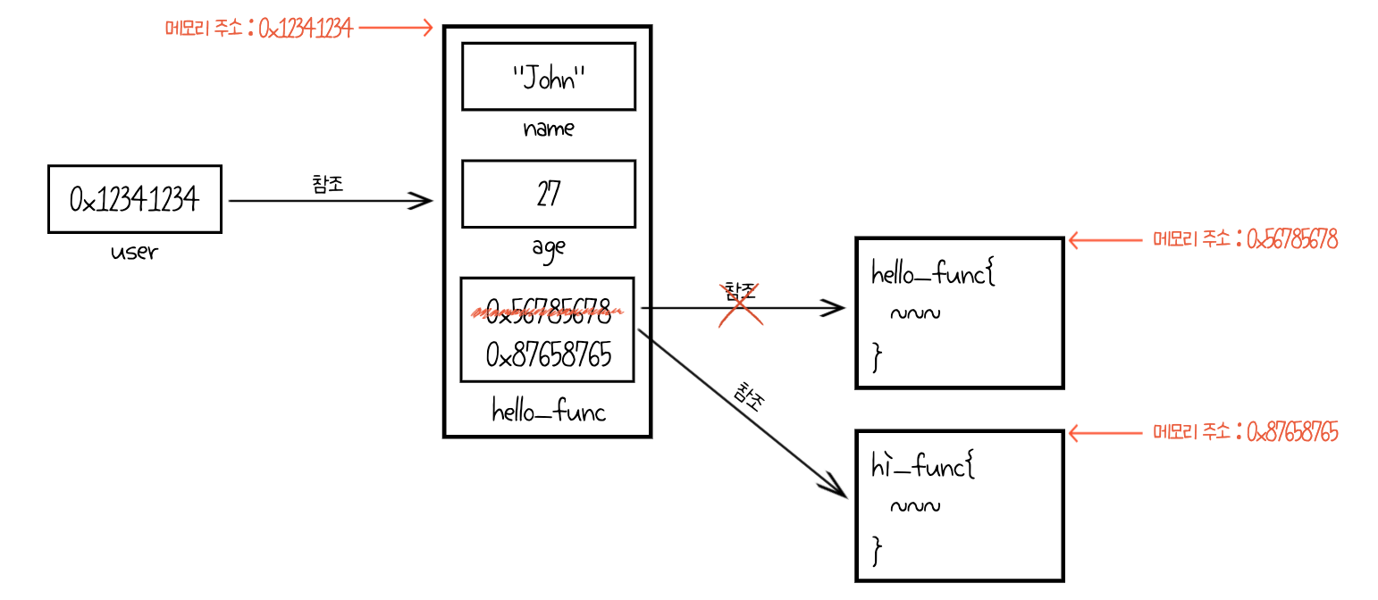 - 객체 내 초기 선언된 함수를 다른 함수로 변경할 수 있음