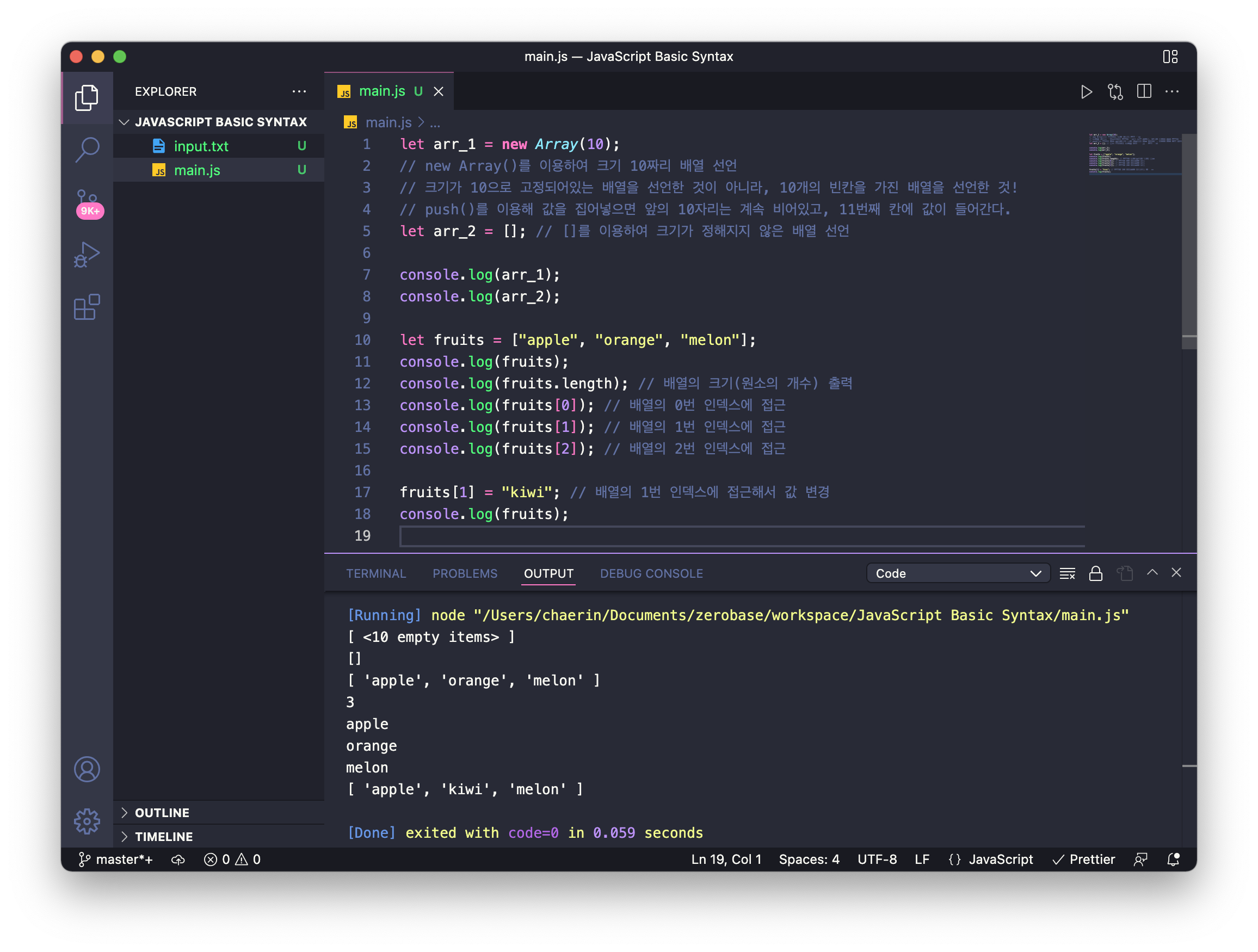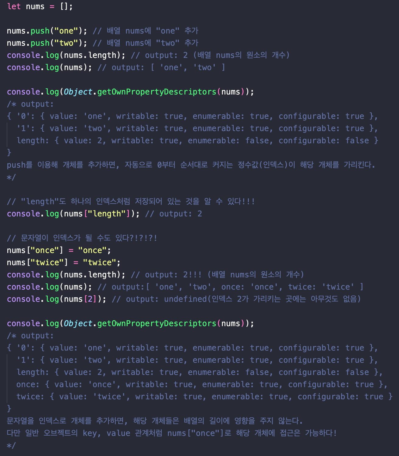 - javaScript에서는 배열이 단지 숫자로 된 키값들을 특별히 인덱스로 취급하는 일종의 '오브젝트'에 불과하다고 한다! o0o 댑악..