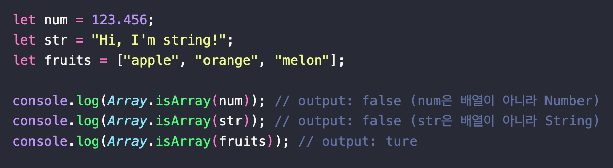 console.log(Array.isArray(num)); // output: false (num은 배열이 아니라 Number)
