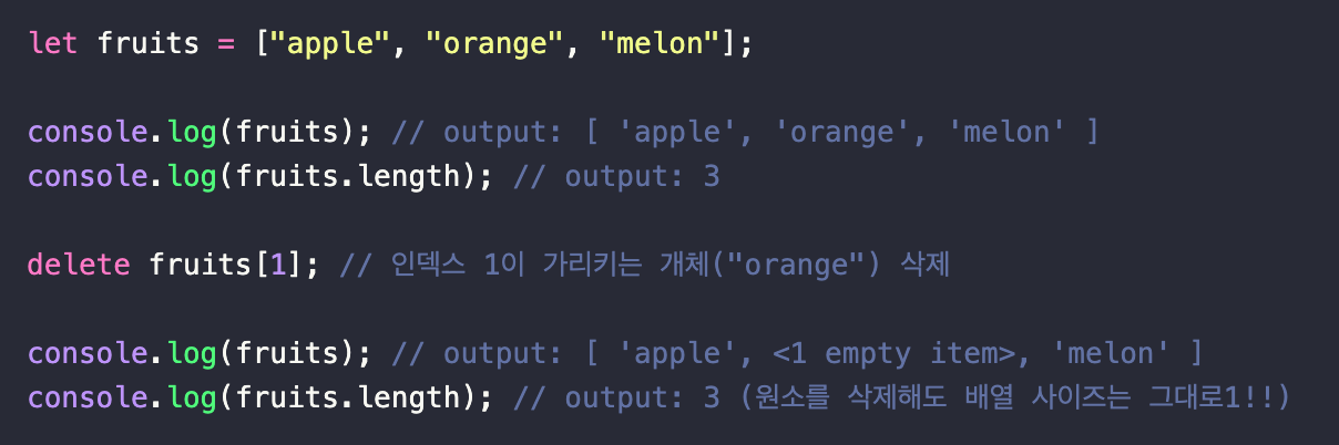 console.log(fruits.length); // output: 3 (원소를 삭제해도 배열 사이즈는 그대로1!!)