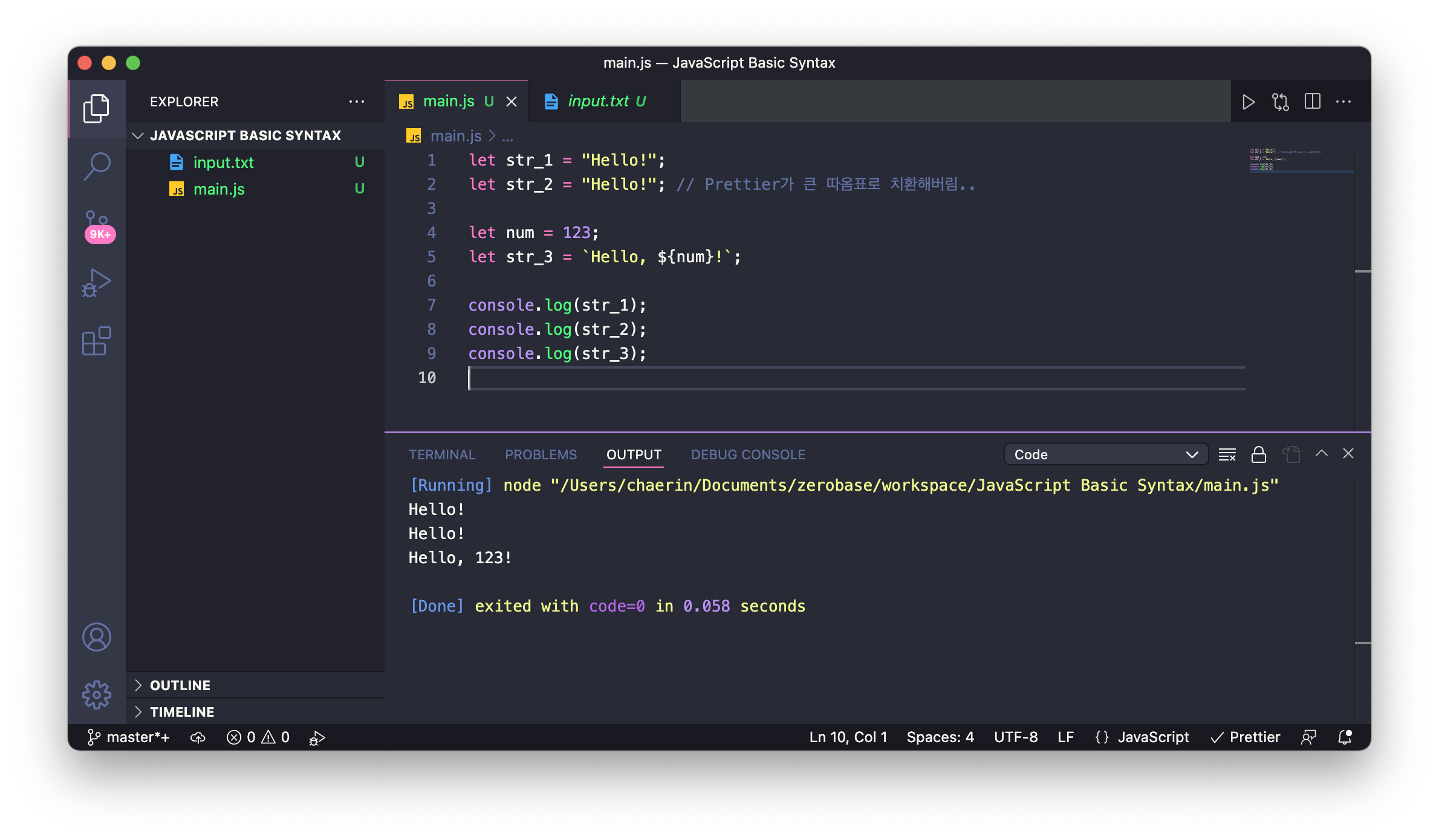 - 큰 따옴표(""), 작은 따옴표(''), 역따옴표(backtick, ``, 키보드의 tab버튼 바로 위에 있음)로 표현 가능