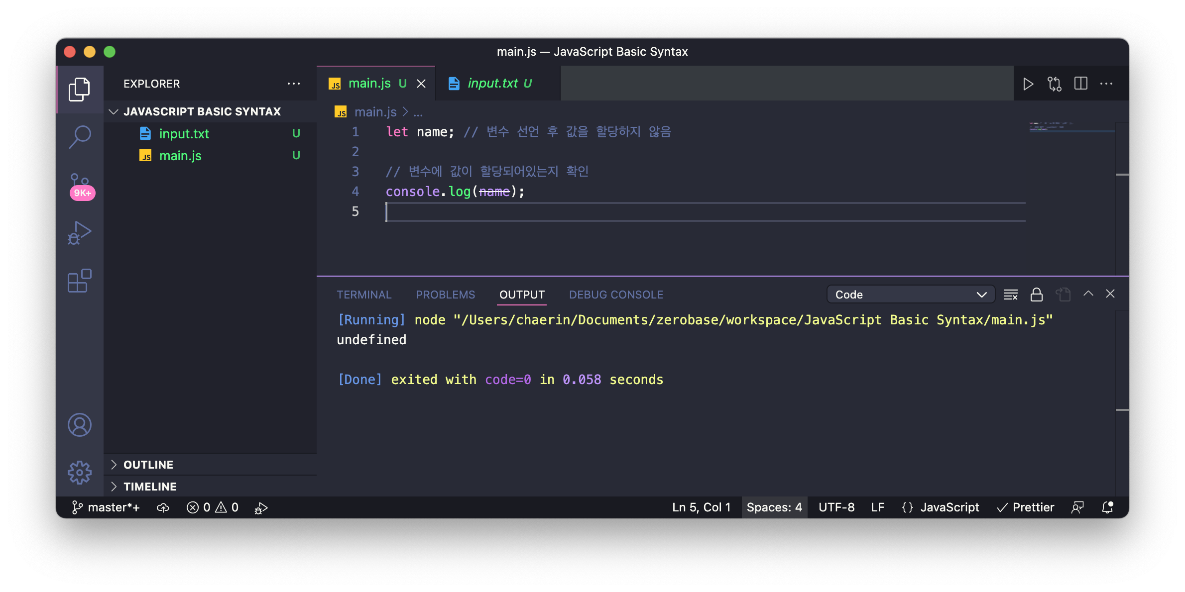 - 변수 선언 후 값을 할당하지 않는다면, undefined가 자동으로 할당